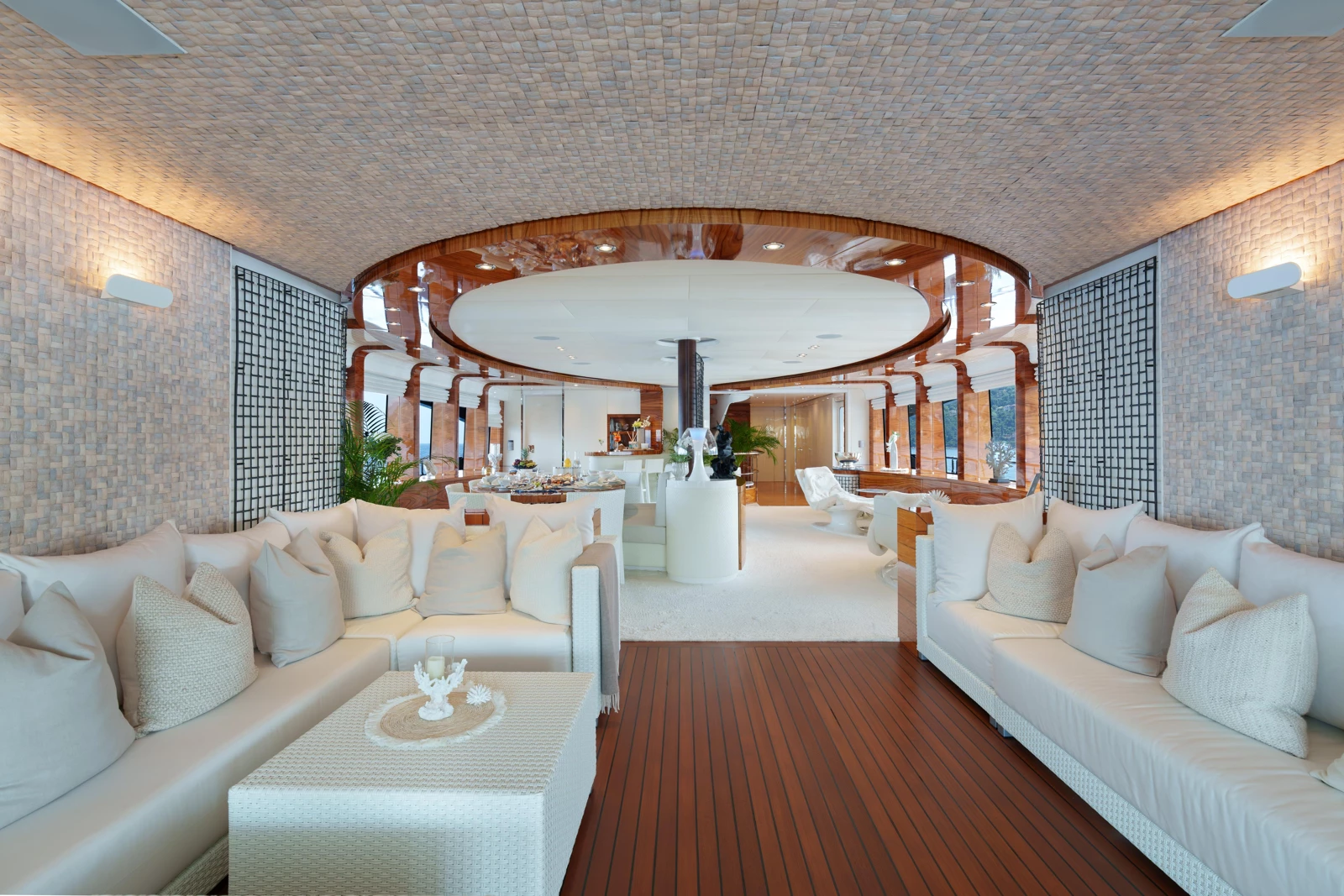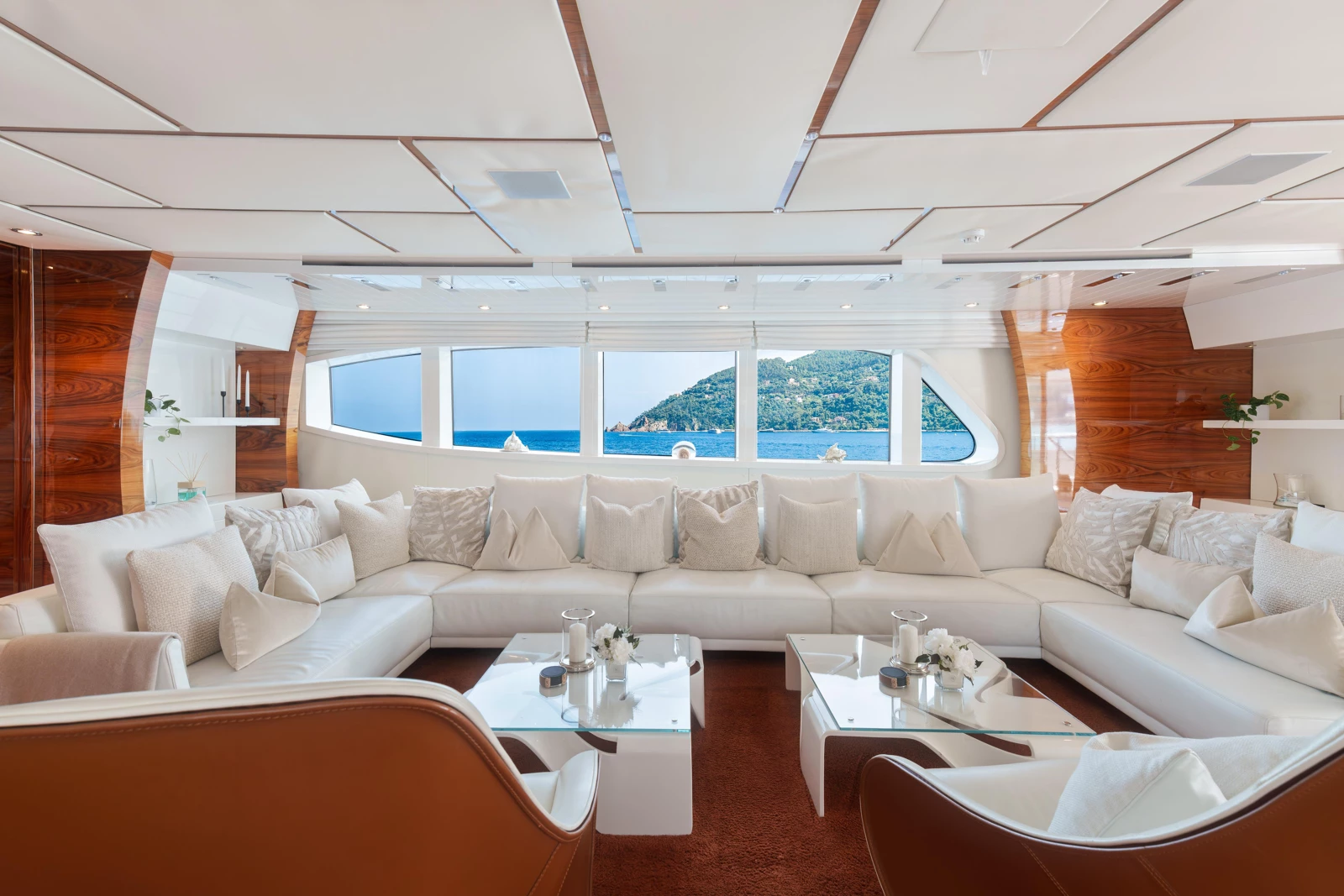 The sundecks are a haven for sun worshippers, complete with a hot tub and ample lounging areas that offer panoramic vistas. Inside, the Art-Line Interior B.V. design team has curated a lavish retreat with a refined color palette, sumptuous furnishings, and intricate design elements. Accommodations include six exquisitely appointed staterooms, capable of hosting up to 12 guests in absolute comfort. The master stateroom is a sanctuary of luxury, complemented by four double cabins and two twin cabins, each designed with meticulous attention to detail.